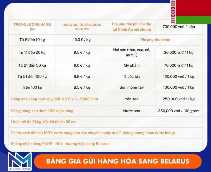 Sau đây là bảng giá dịch vụ gửi hàng đi Belarus giá rẻ của Nhật Minh Express 2026.