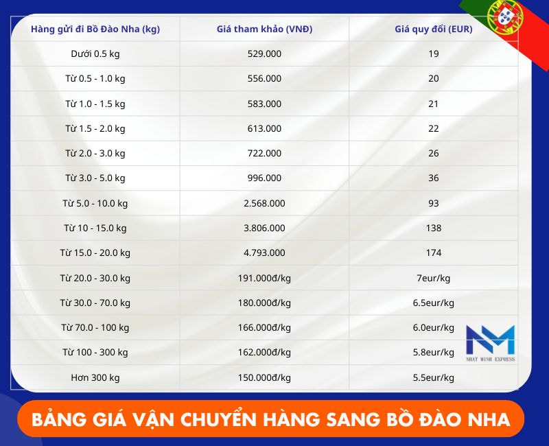 Bảng giá chuyển hàng nhanh quốc tế đi Bồ Đào Nha đang được Nhật Minh Express sử dụng chung cho nhiều loại hàng hóa, sau đây là bảng giá chi tiết mà bạn có thể tham khảo: