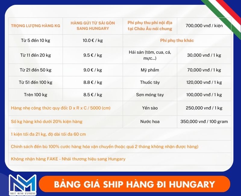 Tại Nhật Minh Express, bảng giá gửi hàng đi Hungary luôn cạnh tranh nhất thị trường, chỉ từ 8,5 Euro/kg (đối với các mức cân nặng lớn). Giá cước vận chuyển hàng hóa đi Hungary phụ thuộc vào loại hàng (hàng thường hay hàng khó) và khối lượng thực tế hoặc thể tích quy đổi. Để nhận báo giá chính xác và các chương trình khuyến mãi mới nhất năm 2026, quý khách vui lòng liên hệ hotline 0937 603 702.