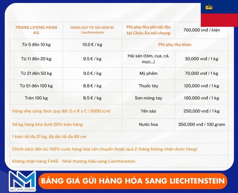 Sau đây là bảng giá gửi hàng đi Liechtenstein giá rẻ 2026 tại Nhật Minh Express: