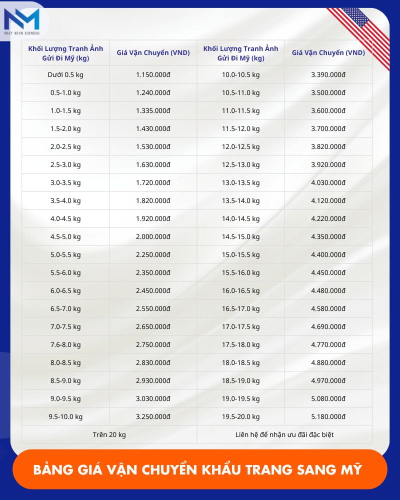 Lưu ý quan trọng là bảng giá gửi tranh ảnh đi Mỹ bên trên chỉ mang tính chất tham khảo. Bởi chi phí gửi hàng quốc tế có thể biến động theo từng thời điểm tùy theo ảnh hưởng của giá nhiên liệu hàng không, mùa vụ và chính sách tỷ giá USD – VND. Để nhận báo giá chính xác nhất cho nhu cầu vận chuyển tranh nghệ thuật của bạn, vui lòng liên hệ hotline 0937 603 702 để được Nhật Minh Express tư vấn miễn phí.
